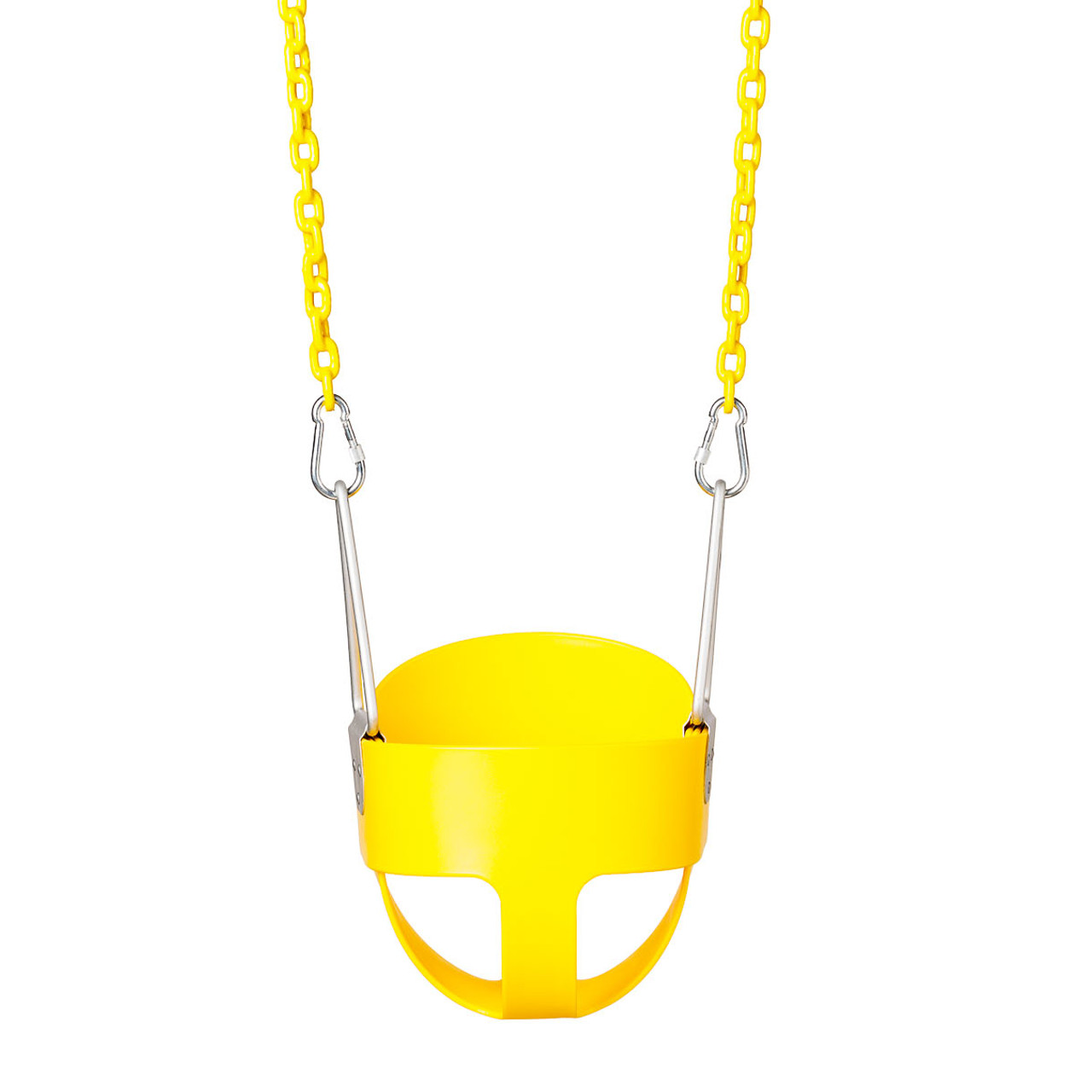 The perfect swing for toddlers before they're ready for a belt swing! This seat combines the Residential CoPoly Full Bucket Swing Seat and our commercial grade 5'6" Plastisol Coated Chain. This chain length is great for swing beams that are around 7-8 ft off the ground. Complete with spring clips and instructions for quick and easy assembly. Plus, buying this bundle saves you 15% vs purchasing the components separately!
