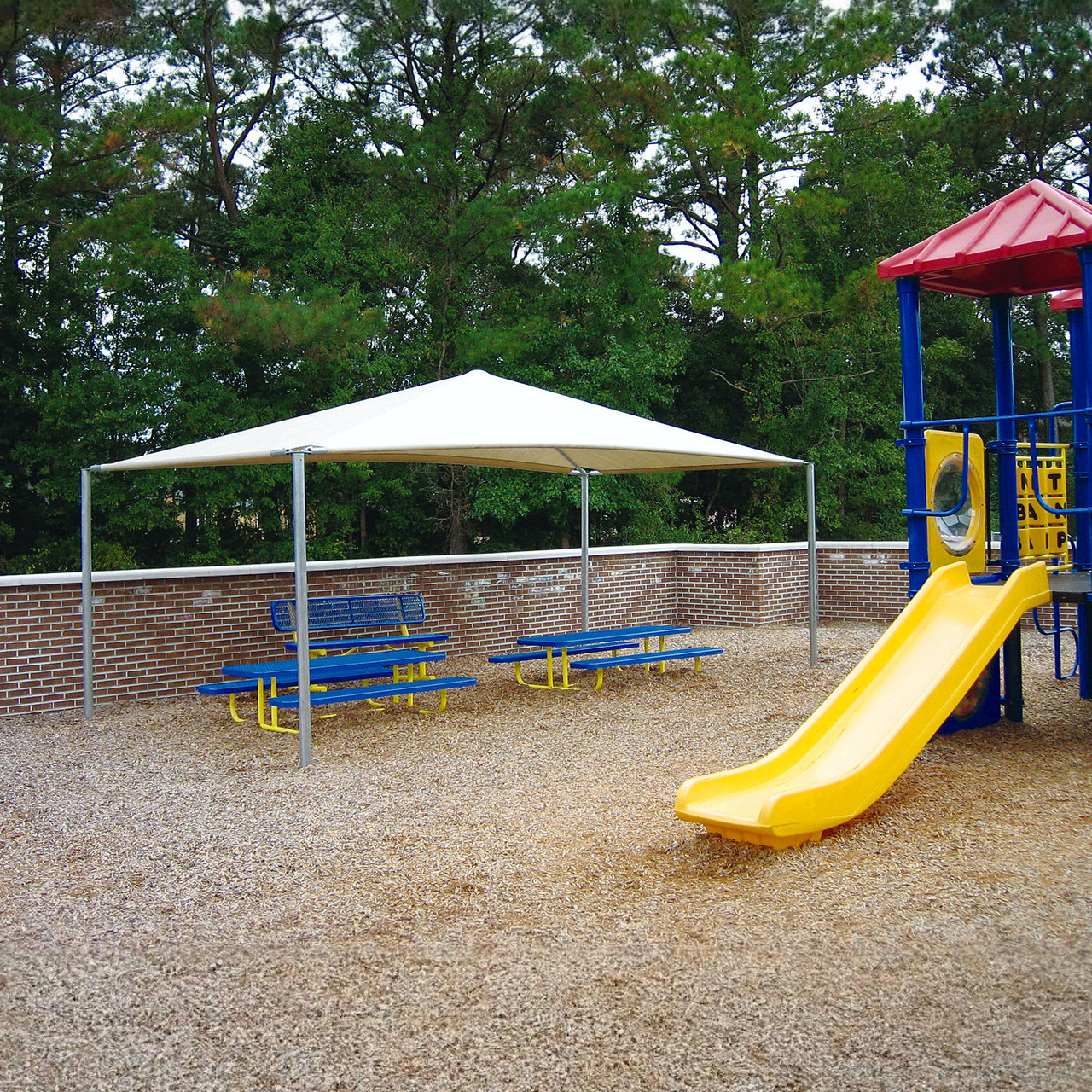 Our Shade Structures are low maintenance, overhead canopies that are an ideal, cost effective shade solution. The fabric is knitted, high density polyethylene, which is UV stabilized and lock stitched. This means it won't fade, mold or rot. If torn, the lock stitch will prevent the canopy from unraveling. While providing shade for play areas, our canopies help block out up to 94% of UV rays.